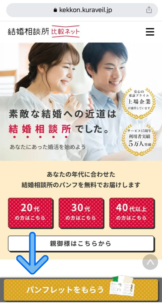 まずは結婚相談所比較ネットにアクセスし、「パンフレットをもらう」をタップします。